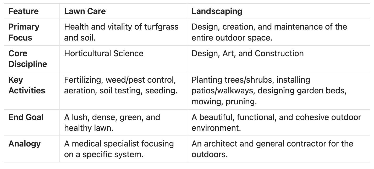 Understanding the difference between lawn care and landscaping empowers property owners to hire the right professional for their specific needs.